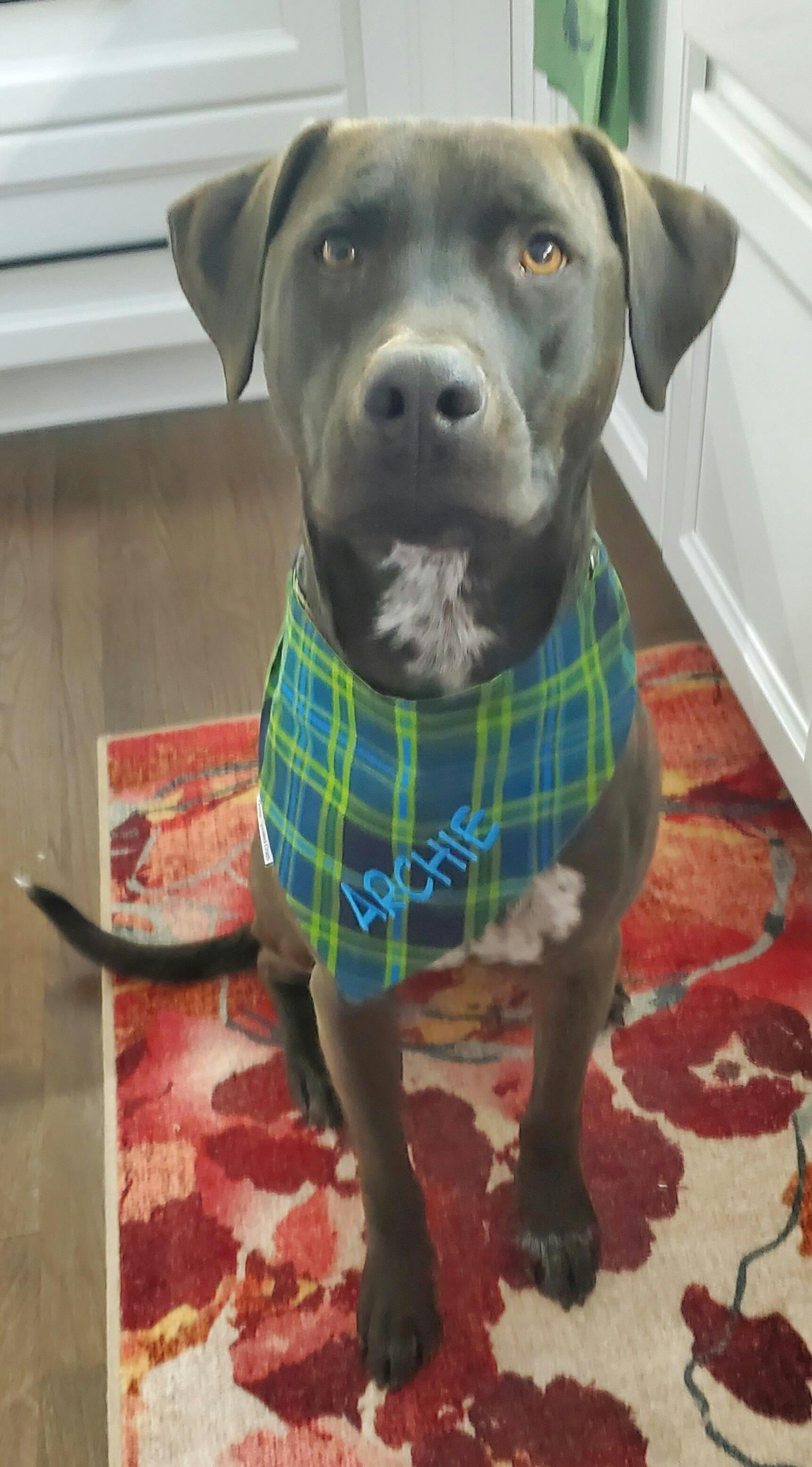 I've bought dozens of dog bandanas over the years. None were made like this where it's slightly rounded to fit my dog's neck without bunching. The quality of the material is superb and embroidery color matched so well. I sent a note because I wasn't sure my choice would look right and asked that they match it for me. It came out great and my little boy looks so handsome!